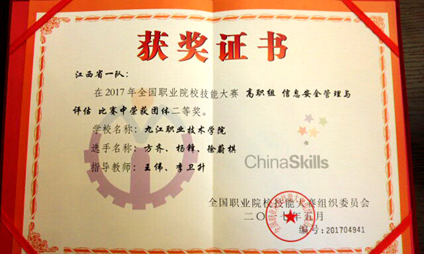 5月17日,2017年全国职业院校技能大赛“神州数码DCN”杯信息安全管理与评估赛项落下帷幕。来自全国各高校的90支队伍,包括1支台湾高校代表队同台竞技,由我校信息工程学院王伟、李卫升老师指导,方齐、杨锋、徐蔚祺3名同学组成的参赛队代表江西省参赛,荣获团体二等奖。